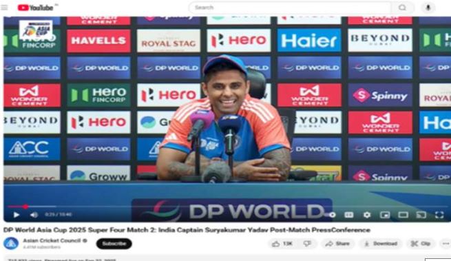 फैक्ट चेक टीम ने इस दावे की सत्यता की जांच की और वायरल वीडियो व तस्वीर का रिवर्स इमेज सर्च किया। इसके अलावा Asian Cricket Council के आधिकारिक यूट्यूब चैनल पर 22 सितंबर 2025 को अपलोड किए गए भारत-पाकिस्तान मैच के बाद की प्रेस कॉन्फ्रेंस का पूरा वीडियो देखा।