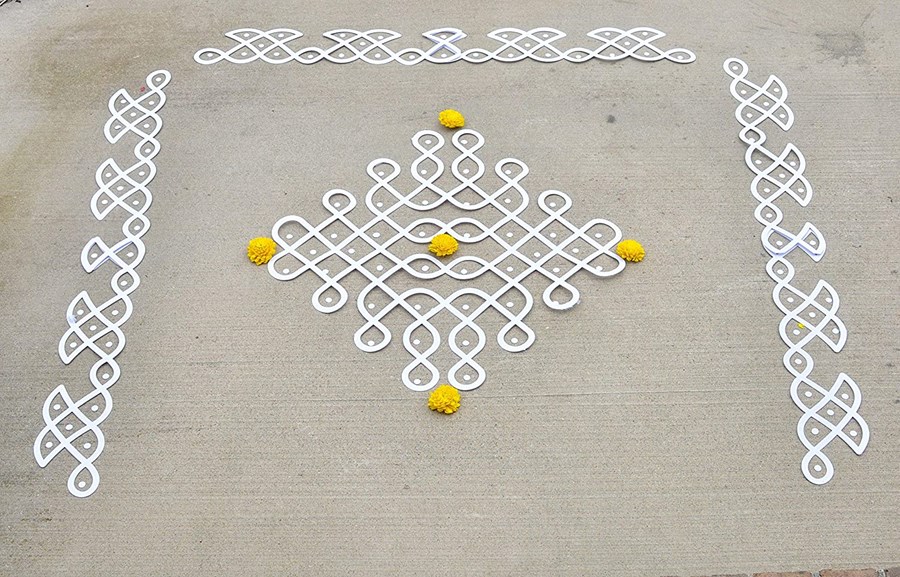 आमतौर पर यह माना जाता है कि घर में पुरुषों के निकलने से पहले रंगोली को घर के सामने निकालना पड़ता है | आंध्र और तेलंगाना में पोंगल त्योहार के समय सभी महिलाएं रंगोली के सामने गाना गाती है | गाते हुए उसके चारों ओर घूमती हैं और वे गोबर के एक टुकड़े को बीच में एक फूल से सजाकर रख देती हैं जिसे गोबम्मा कहा जाता है ।